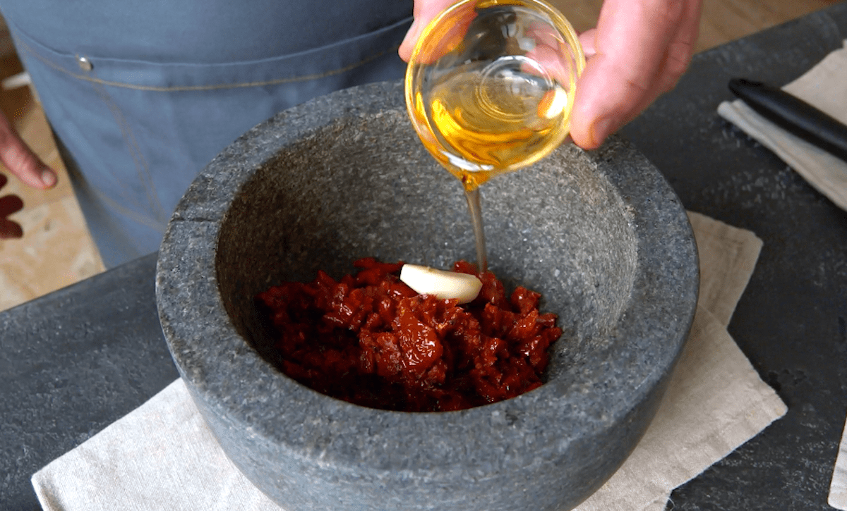 5. Röste Cashewkerne in einer Pfanne ohne Fett an und lasse sie daraufhin abkühlen. Gib abgetropfte getrocknete Tomaten klein geschnitten in einen Mörser und füge Knoblauch, Olivenöl, die Cashewkerne, Parmesan, Salz und Pfeffer hinzu, zerstampfe alles und vermenge es gut miteinander (funktioniert auch in einem Becher mit Stabmixer).