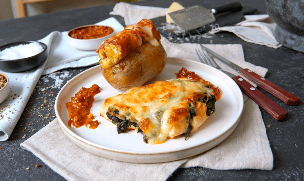 Dieses Rezept ist perfekt für Koch-Anfänger. Es ist wirklich schnell und einfach zubereitet und sieht am Ende wirklich mehr als passabel aus. Und dazu schmeckt es auch noch unwiderstehlich. Wir zeigen dir heute, wie man supersaftige Hähnchenbrust mit Spinat und gefüllten Backkartoffeln zubereitet. Und das Beste ist, das alles schön mit Käse überbacken ist. Dazu reichen wir ein selbst gemachtes Tomatenpesto.