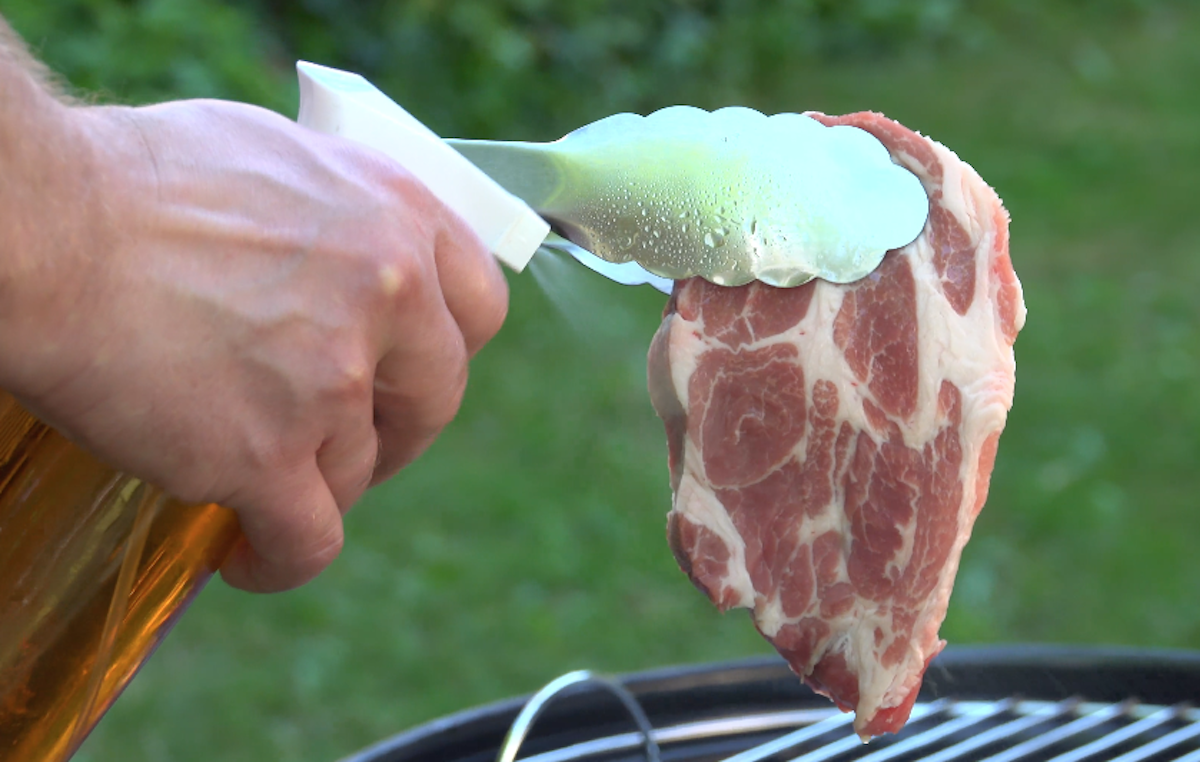 Damit dein Steak zart wird, aber von außen schön kross bleibt, gibt es einen Geheimtrick: Sprüh das Fleisch mit Apfelsaft ein. Du wirst überrascht sein, wie gut das funktioniert.