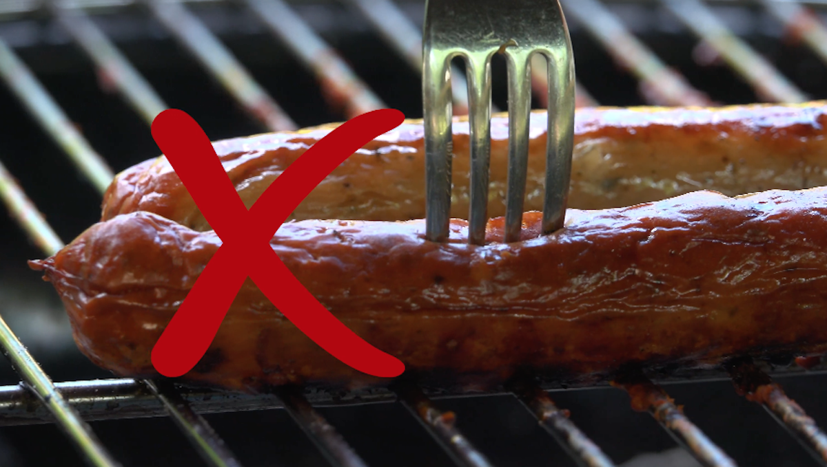 Stich und schneide niemals in das Würstchen, solange es auf dem Grill liegt. Zum einen stichst du es kaputt und zum anderen tropft das Fett heraus. Das führt dazu, dass der Grill qualmt, gesundheitsschädliche Stoffe entstehen und das Fleisch am Ende an Geschmack verliert. Durch das verlorengegangene Fett trocknet es außerdem aus.