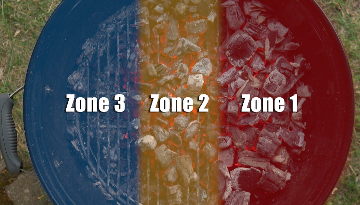 Teile den Grill in drei Kohle-Zonen ein. Dort, wo die Kohle dicht an dicht gelagert ist, ist die heißeste Zone (Zone 1). Im Drittel mit der etwas lockerer verteilten Kohle (Zone 2) herrscht mittlere Hitze. Das letzte Drittel bleibt komplett ohne Kohle. So kannst du das Fleisch auf verschiedenen Stufen garen und es dort, wo keine Kohle ist (Zone 3), warmhalten, und mit direkter und indirekter Hitze grillen.