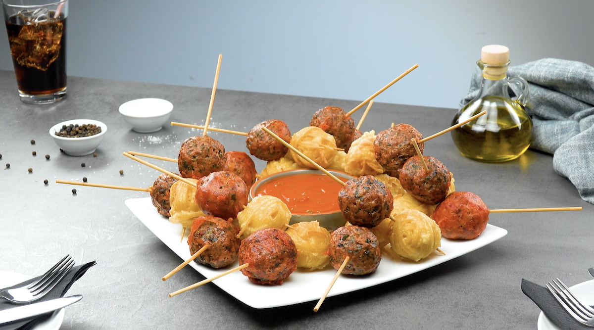 Eine klassische Kombination, die eigentlich nie enttäuscht, sind Spaghetti mit Hackfleisch. Aber auf die folgende Art und Weise hast du sie bestimmt noch nie gegessen. Dieses Rezept zeigt dir, wie genial man Hackbällchen mit Käse und Spaghetti, frittiert in Tempura-Teig, zubereiten kann. Ein köstlicher „Fingersnack“, der blendend auf ein Partybuffet oder zu einem TV-Abend mit Freunden passt.