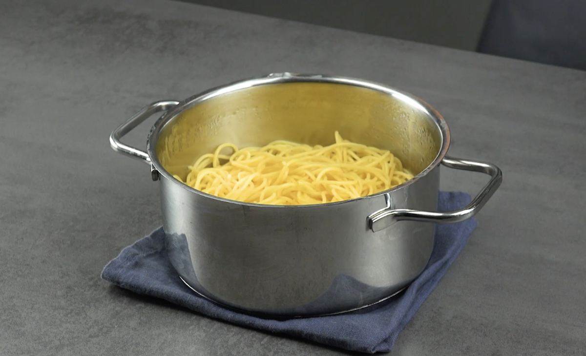 4.) Koche nun die Spaghetti in Salzwasser. Gieße das Nudelwasser ab, gib ein Ei, ein weiteres Eigelb sowie etwas Pfeffer hinzu und lasse sie auskühlen.