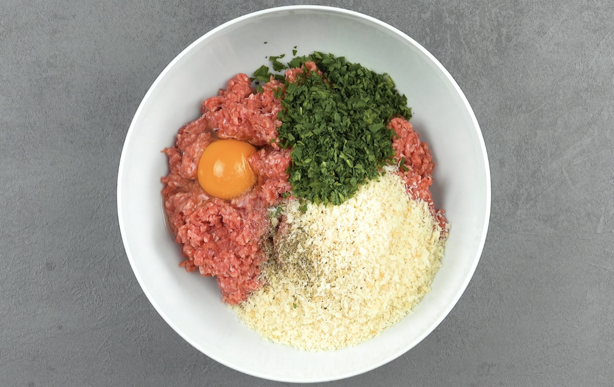 2.) Gib das Hackfleisch in eine Schüssel und füge Ei, Paniermehl, Petersilie, Salz und Pfeffer hinzu und vermenge alles miteinander.