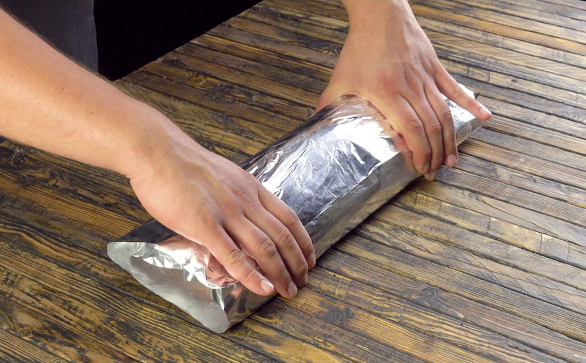 4.) Rolle als Nächstes das Kunstwerk mithilfe der Alufolie zusammen und verpacke somit den Braten für das Backen.