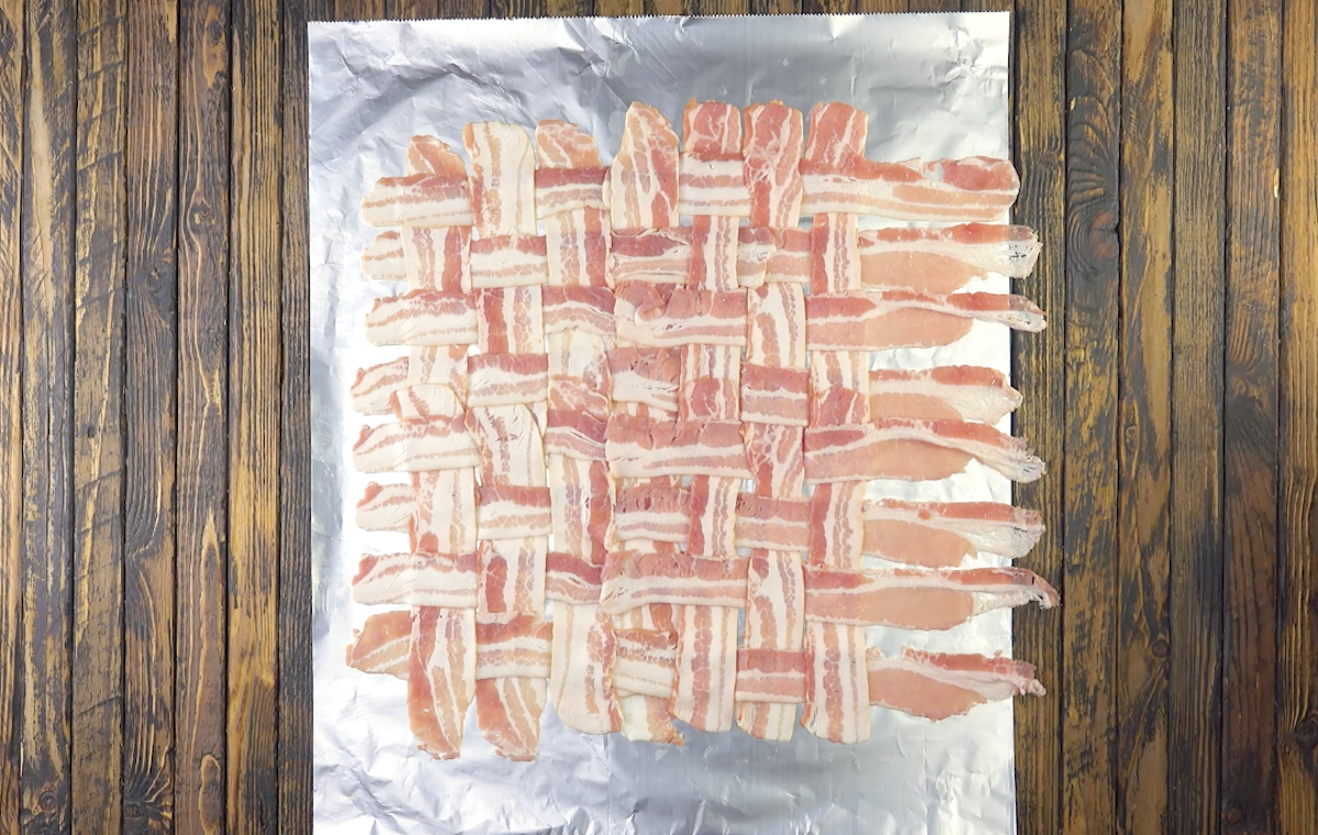 2.) Dann nimmst du ein großes Stück Alufolie und flichtst die Speckscheiben darauf zu einem Gitter. Auf 3 Seiten der Folie solltest du dabei einen großzügigen Rand lassen. Die Hackfleischmasse wird als etwas kleineres Quadrat als der Speck auf diesem verteilt, sodass dieser auf allen Seiten etwas übersteht.