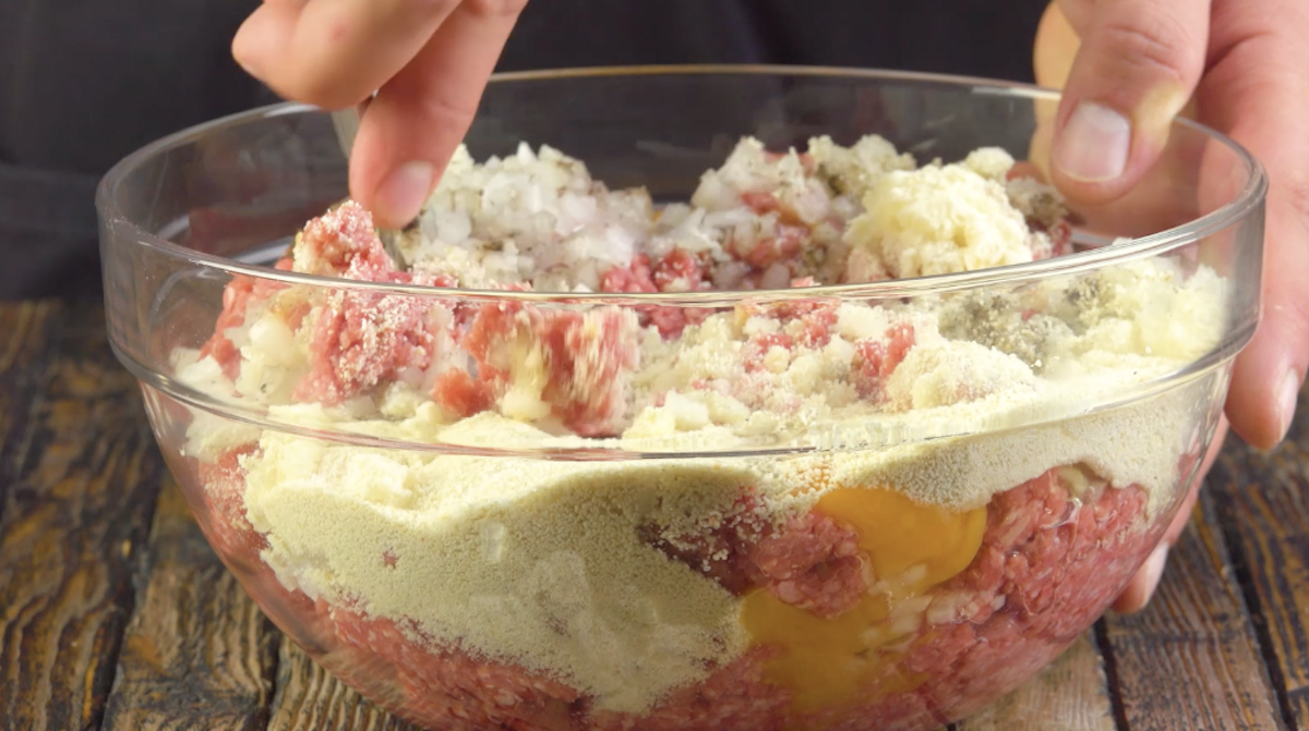 - 1.) Der erste Schritt ist ganz einfach: Vermenge die Zutaten für die Hackfleischmischung sorgfältig miteinander in einer großen Schüssel.
