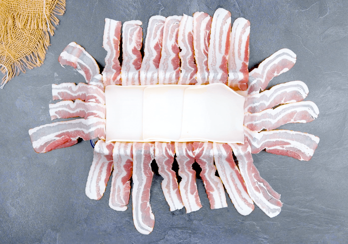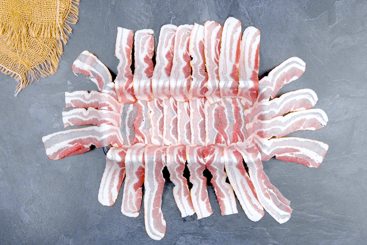 4. Fette die kleine Kastenform ein und belege den Boden mit einander leicht überlappenden Speckstreifen. Lege Speckstreifen ebenfalls über die Ränder und lass sie vorerst aus der Form heraushängen.