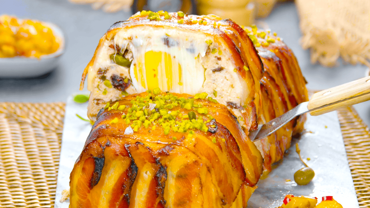 Diesen supersaftigen Hackbraten mit Ei und knusprig-karamellisiertem Speckmantel kannst du sowohl heiß als auch abgekühlt genießen; dazu passt hervorragend ein Mango-Chutney.