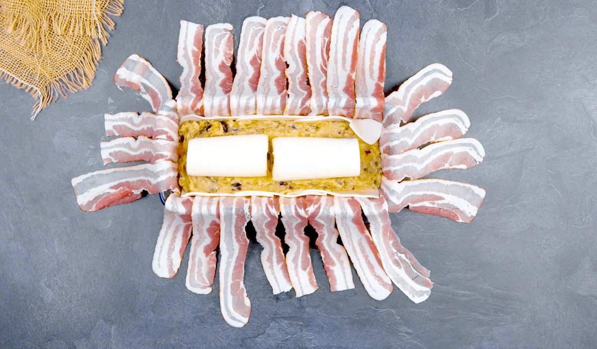 8. Klappe zunächst die Speckstreifen der Schmalseiten und dann diejenigen der Längsseiten über das Geflügelhackfleisch.