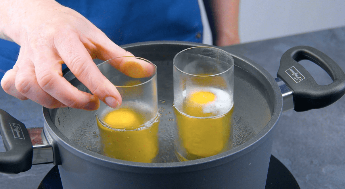 2. Lass die beiden Eigelbe in den Gläsern etwas abkühlen. Löse sie dann heraus und gib je eines in ein etwas größeres, ebenfalls hohes und schmales Glas. Gieße dann in jedes Glas gleich viel Eiweiß und stelle die Gläser ebenfalls etwa 5 Minuten in kochendes Wasser, bis auch das Eiweiß geronnen ist. Lass die Eier anschließend etwas abkühlen.
