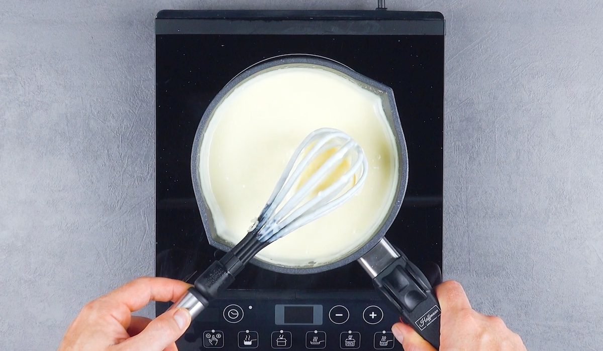 3. Bereite die Béchamelsauce zu. Schmilz dafür die Butter in einem Topf, gib das Mehl hinzu und lass die Mischung für 2-3 Minuten anziehen. Sie sollte jedoch keine Farbe bekommen. Fülle dann die Milch hinzu und bringe das Ganze unter ständigem Rühren zum Kochen. Rühre abschließend den Käse unter, bis er geschmolzen ist, und schmecke die Béchamelsauce mit Salz ab.