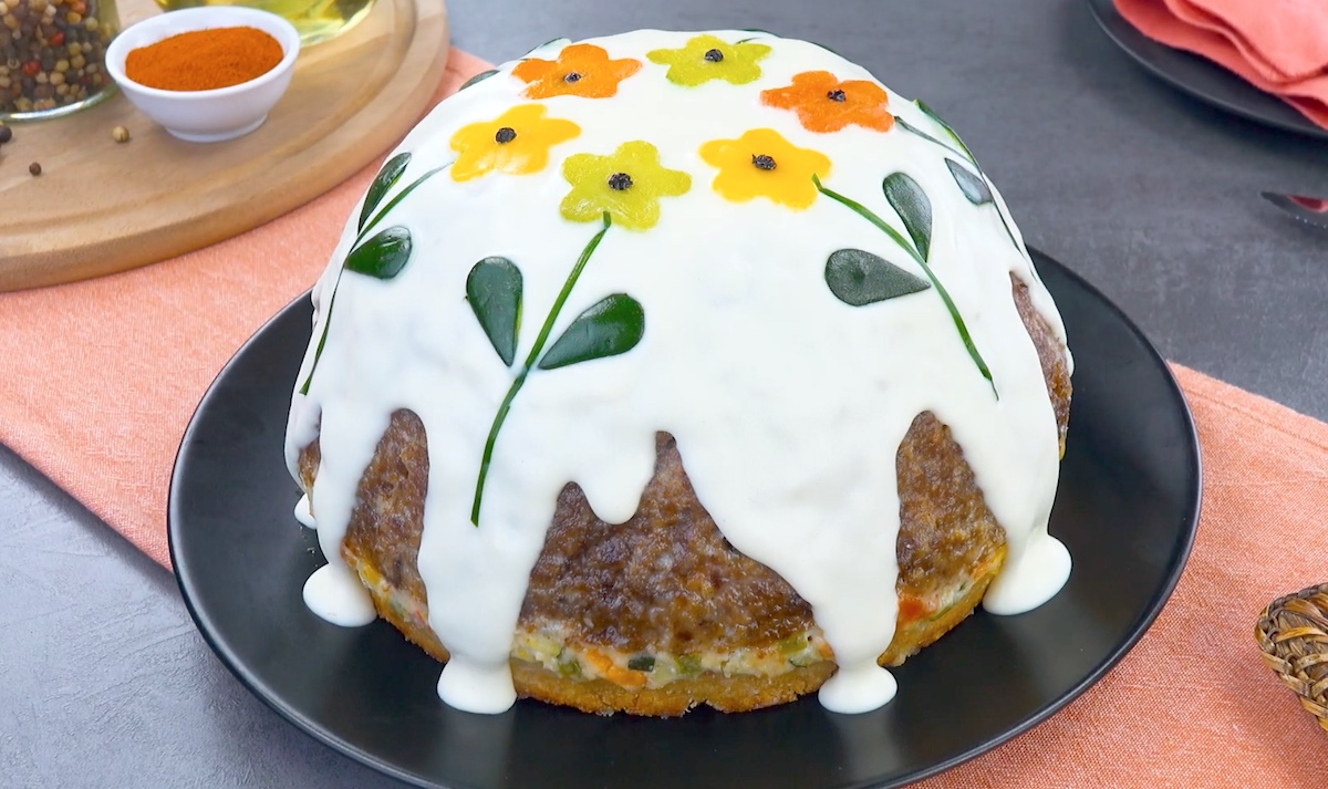 9. Stürze den Hackfleischturm vorsichtig. Übergieße ihn dann mit der zweiten Hälfte der Béchamelsauce; erwärme diese gegebenenfalls vorher nochmal. Verpasse dem Turm dann mit Gemüseblumen, Zucchini, Schnittlauch und Pfefferkörnern ein florales Muster.