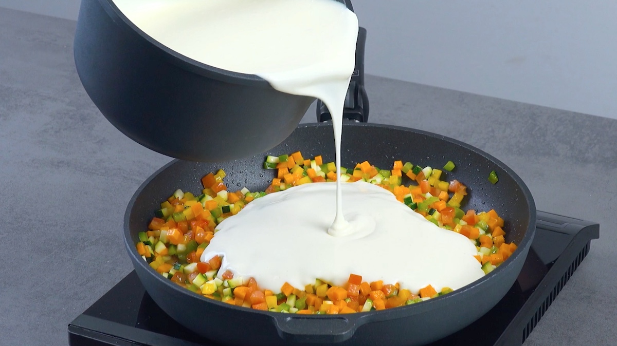 4. Schwitze das Gemüse mit etwas Öl in einer Pfanne an und würze es mit Salz und Pfeffer. Rühre dann die Hälfte der Béchamelsauce in die Gemüsemischung.