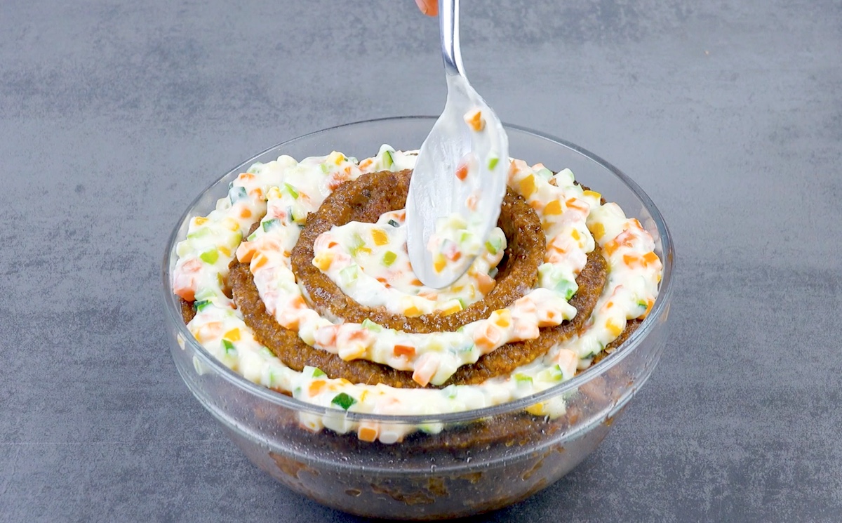 5. Teile die Gemüsemischung nun auf die drei Hackfleischschalen auf und stelle diese ineinander.