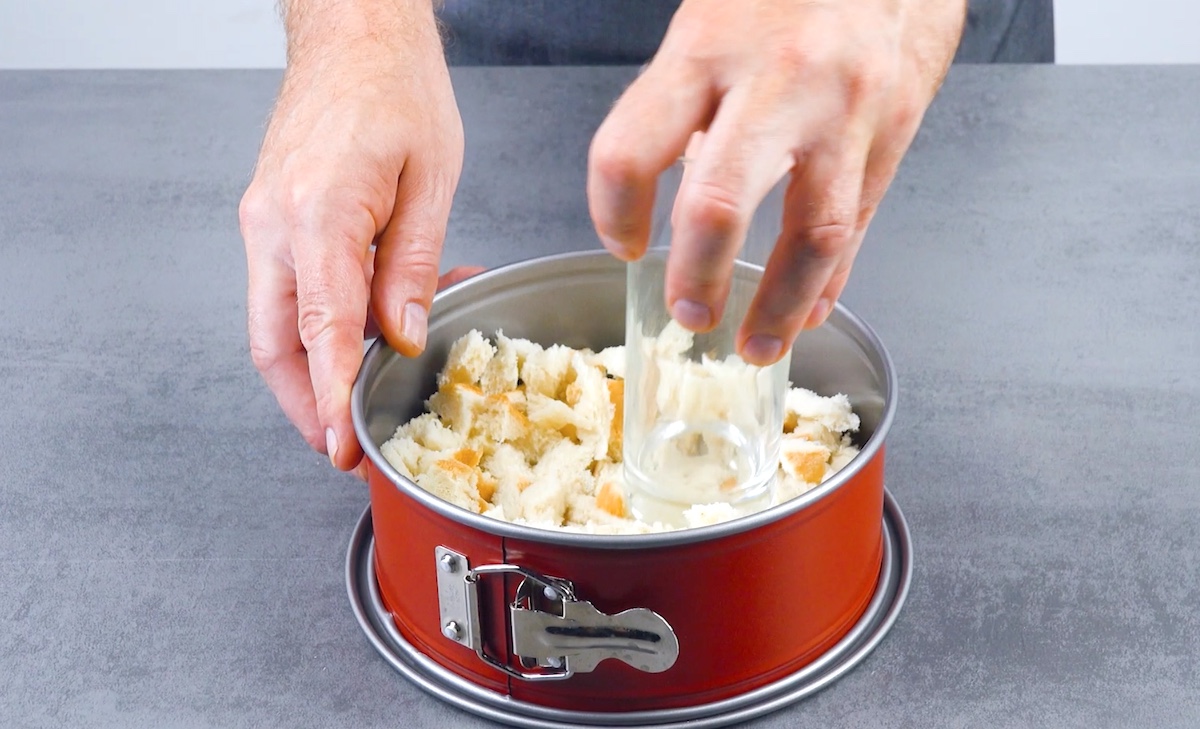 2. Zerreiße das Toastbrot und drücke es mithilfe eines Glases fest auf den Boden einer Springform, sodass ein Toastboden entsteht.