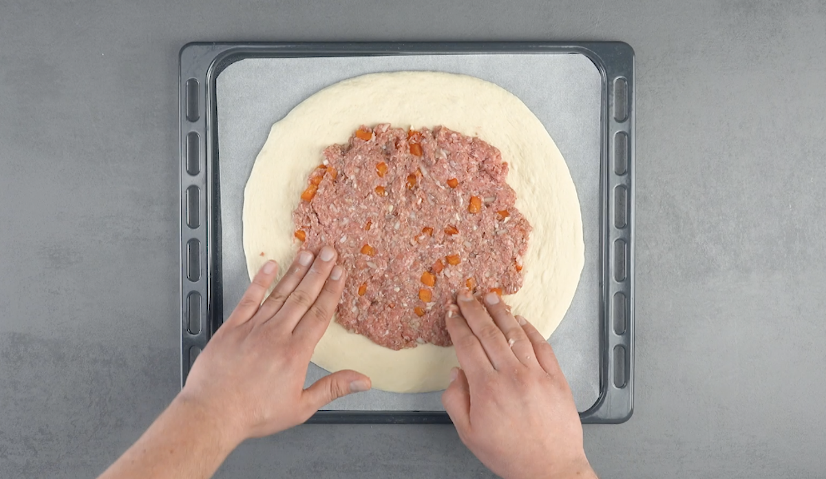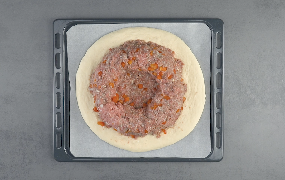4. Rolle nun ca. 700 g des gekühlten Teigs rund aus (ca. 30 cm Durchmesser) und verteile ca. 1/3 der Hackfleischmasse in dessen Mitte. Es sollte ein etwa 7 cm breiter Rand unbelegt bleiben.