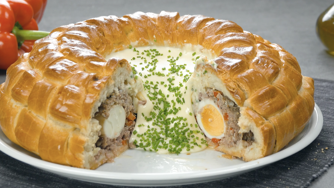 Folgendes Rezept besticht nicht nur durch seinen köstlichen Geschmack, sondern vor allem durch seinen besonderen Look. Nach dem Backen sieht das Flechtwerk aus Teig wie ein richtiger Korb aus. Wir verfeinern zunächst Hackfleisch mit Paprika, verpacken das Hackfleisch und hart gekochte Eier in Teig und setzen am Ende zur Krönung noch einen Camembert in die Mitte. Einfach nur köstlich!