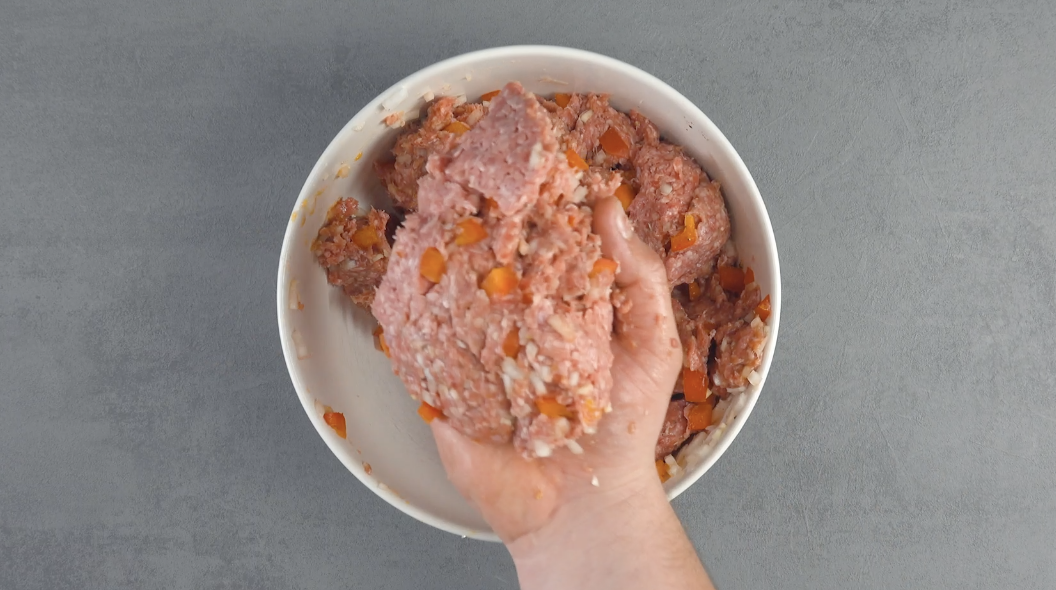 3. Gib Hackfleisch, Eier, klein geschnittene Paprika, Zwiebel und Knoblauch in eine Schüssel. Füge Salz und Pfeffer hinzu und vermenge alles mit deinen Händen.