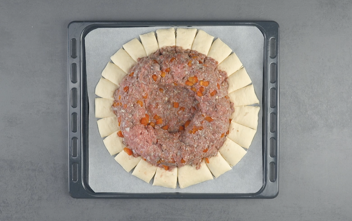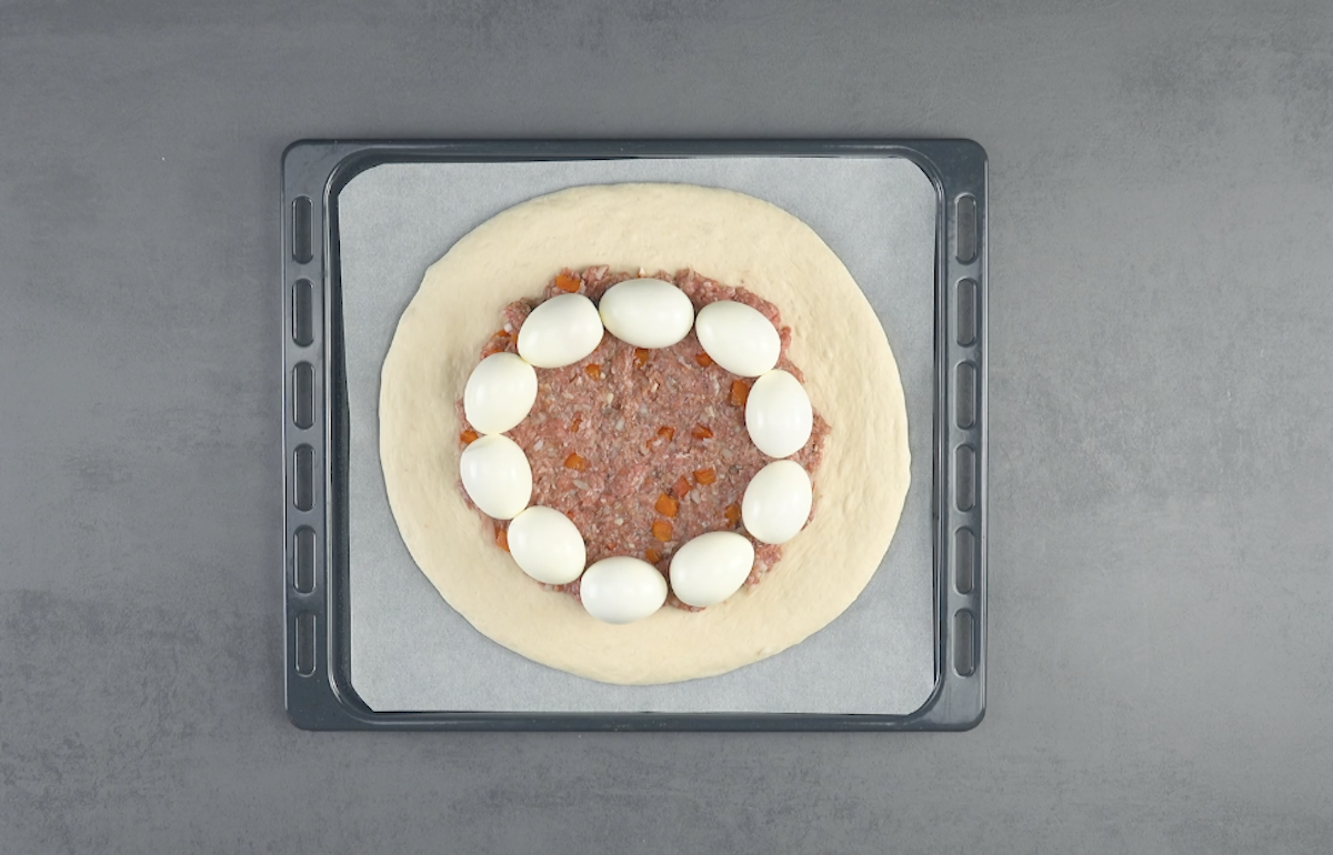 5. Verteile die gekochten Eier aus Schritt 2 auf dem Rand der Hackfleischmasse.