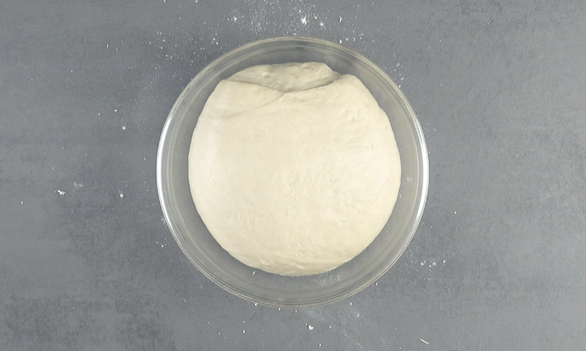1. Als Erstes bereitest du den Teig zu. Am besten machst du das am Abend vor der Zubereitung des Hackfleischs, da der Teig eine Nacht im Kühlschrank ruhen sollte. Gib Mehl, Öl, Hefe, Wasser, Salz und Zucker in eine Schüssel und verarbeite alles mit deinen Händen zu einem glatten Teig.