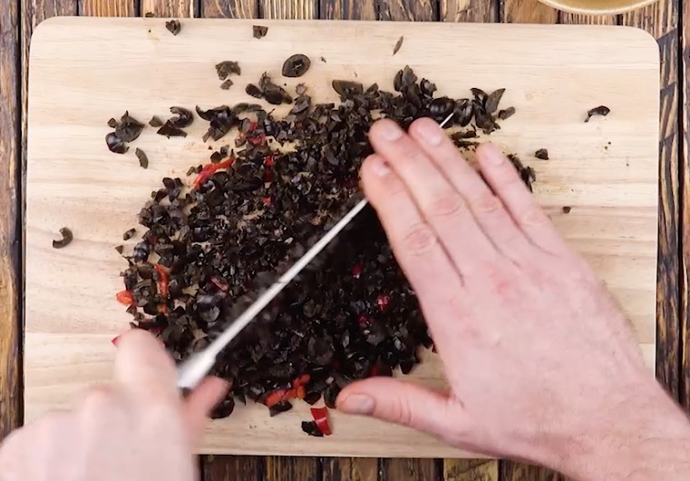 3.) Stelle dann die Tapenade her: Zerkleinere dafür zunächst die Chilischote, gib dann die Oliven ebenfalls auf die Arbeitsfläche und hacke die beiden Zutaten grob. Reibe anschließend die Zitronenschale darauf und hacke alles zusammen noch einmal, bis feine Stückchen entstehen.
