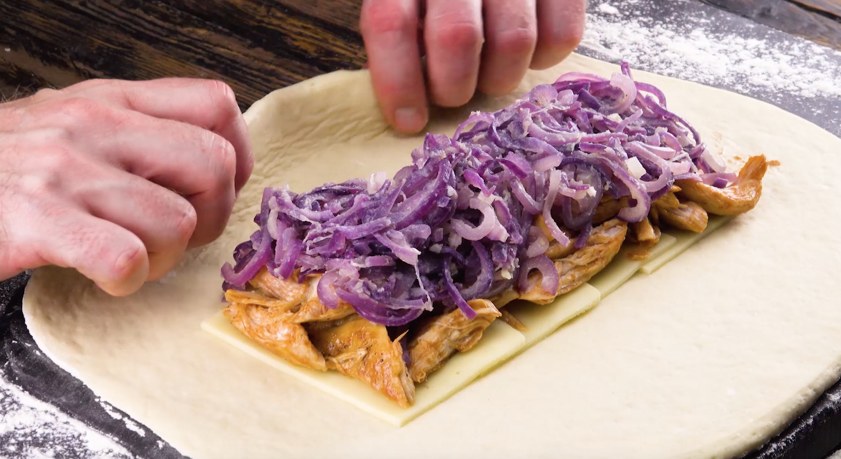 3.) Walze den Pizzateig auf einer bemehlten Arbeitsfläche zu einem Rechteck aus und lege die Käsescheiben, einander leicht überlappend, in die Mitte in einer Linie auf den Teig. Verteile nun gleichmäßig das Hühnchen und dann die Zwiebeln auf dem Käse.