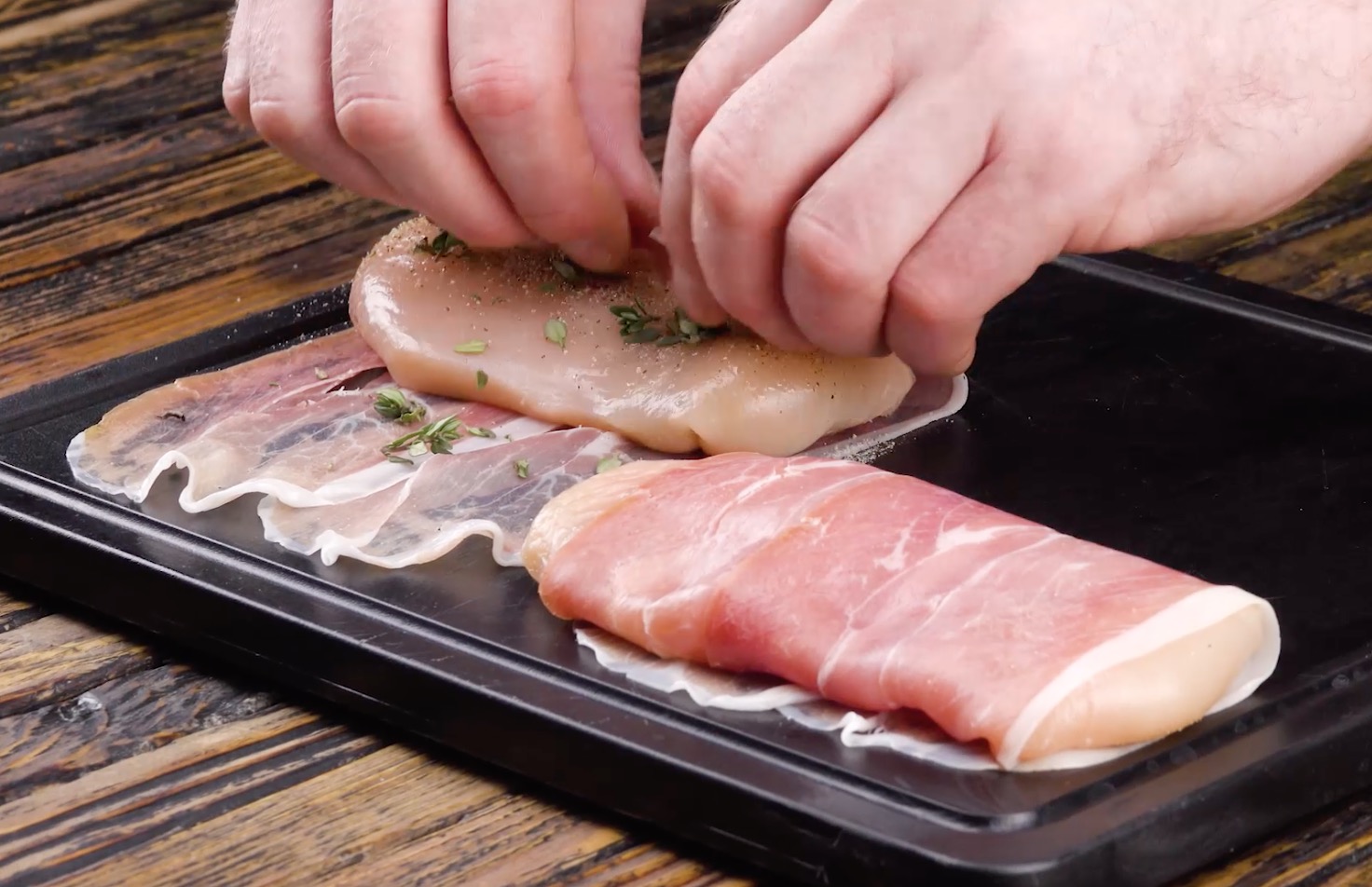 1.) Lege die Schinkenscheiben so auf ein Backblech, dass jeweils zwei einander überlappen. Quer in die Mitte kommt auf beide Scheibenpaare eine Hühnerbrust. Salze und pfeffere dann das Hühnchen und streue die Nadeln eines der Thymianzweige darauf.