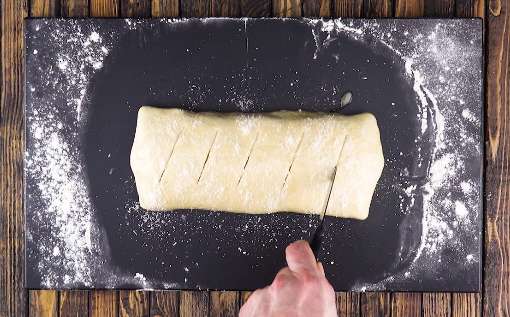 Als Nächstes streust du den Parmesan auf den Teig und machst dann ein paar diagonale Einschnitte auf der Oberfläche.