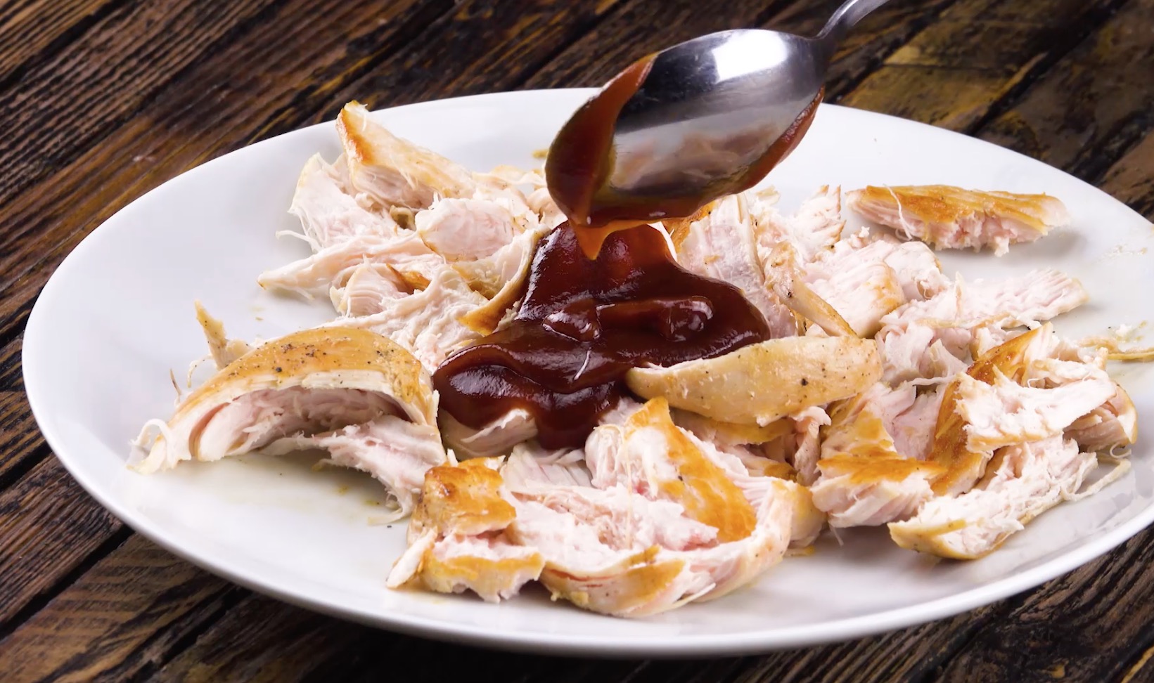 2.) Zerpflücke das Hähnchen dann mit zwei Gabeln in mundgerechte Stücke und vermische diese dann mit der Barbecuesoße.