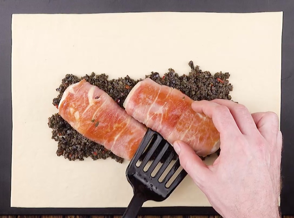4.) Verteile die Tapenade dann längs in der Mitte des rechteckig ausgerollten Pizzateigs und ordne die Hühnerbrüste diagonal darauf an.