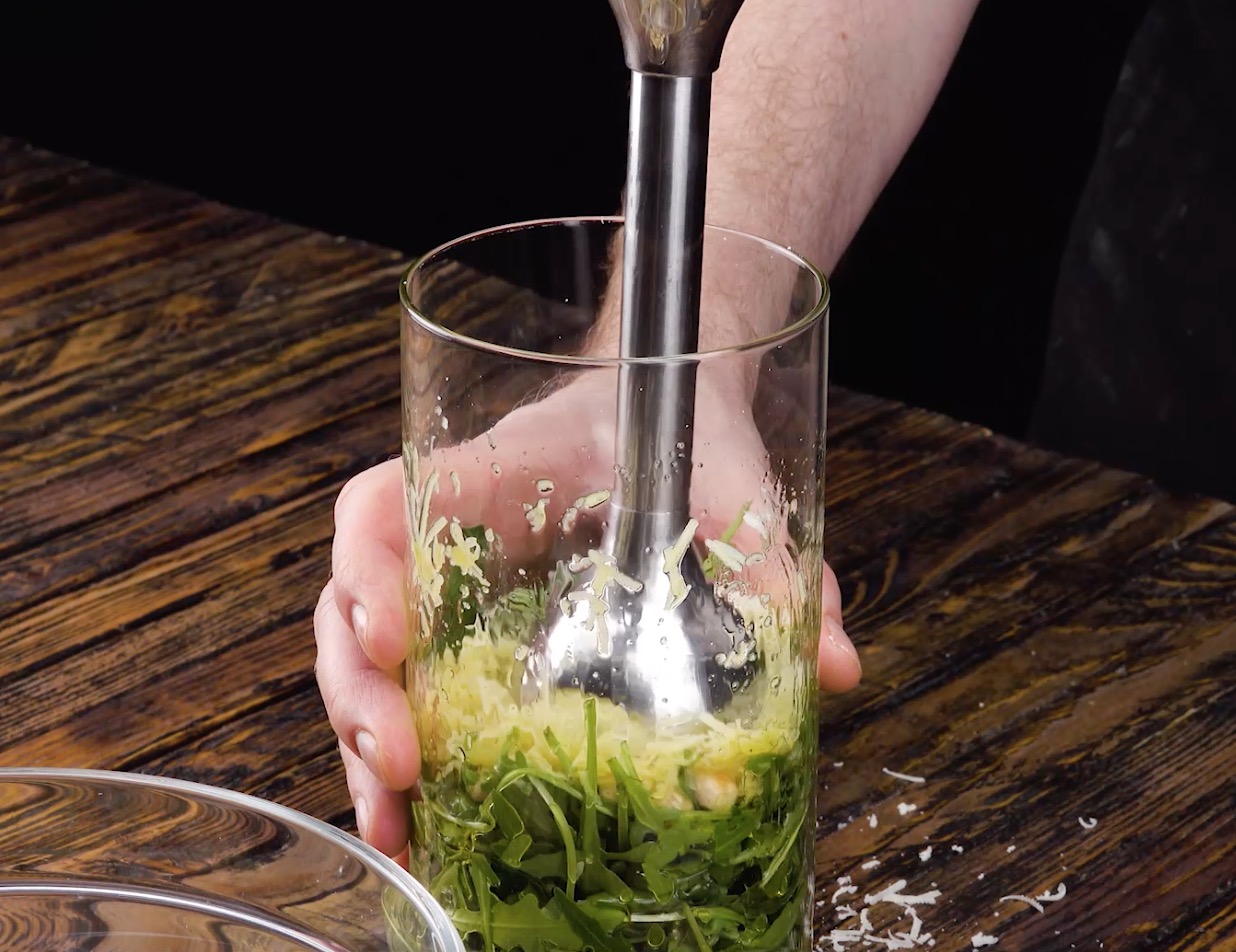 2.) Bereite nun die Pestosoße zu: Dazu gibst du den Rucola, die Haselnüsse, Salz und Pfeffer sowie den Parmesan und das Olivenöl in ein hohes Gefäß und pürierst die Zutaten, bis sie flüssig sind.