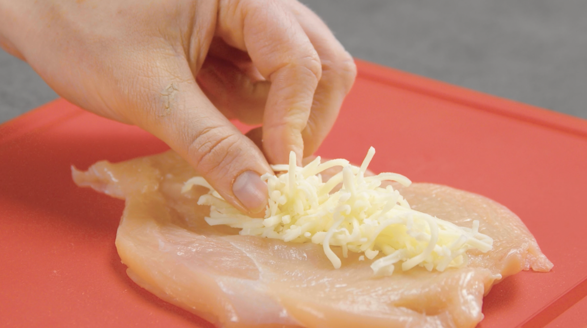 3. Halbiere die Hähnchenbrüste (aber nicht ganz durchschneiden), klappe sie auf und lege Frischhaltefolie darüber. Klopfe die Hähnchenbrüste platt. Fülle sie nun mit geriebenen Mozzarella (ca. 1 EL) und klappe sie wieder zusammen.