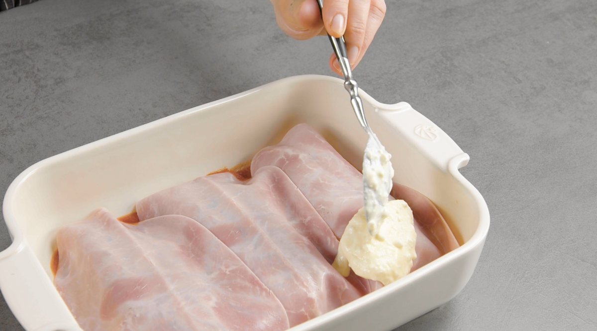 6. Dann kommt eine Schicht Ricottacreme auf den Schinken.