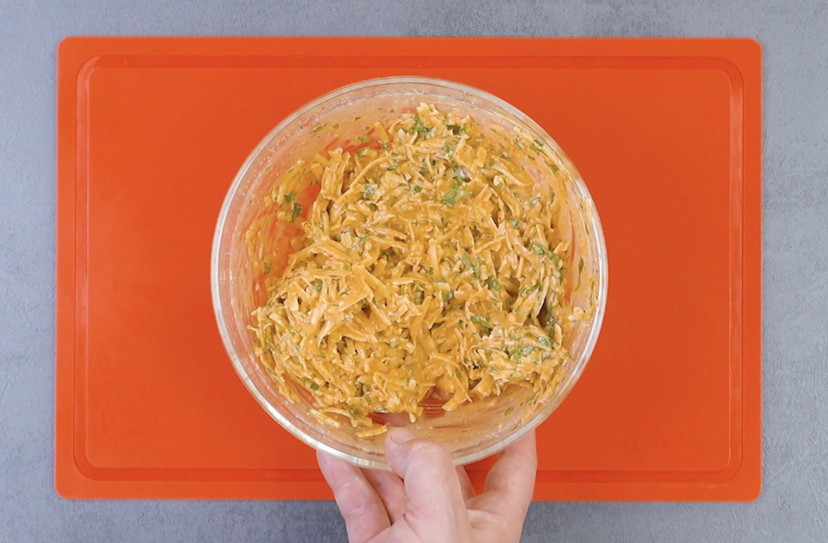 4. Vermische die kleingehäckselte Masse mit Paprikawürfeln und Schnittlauch.