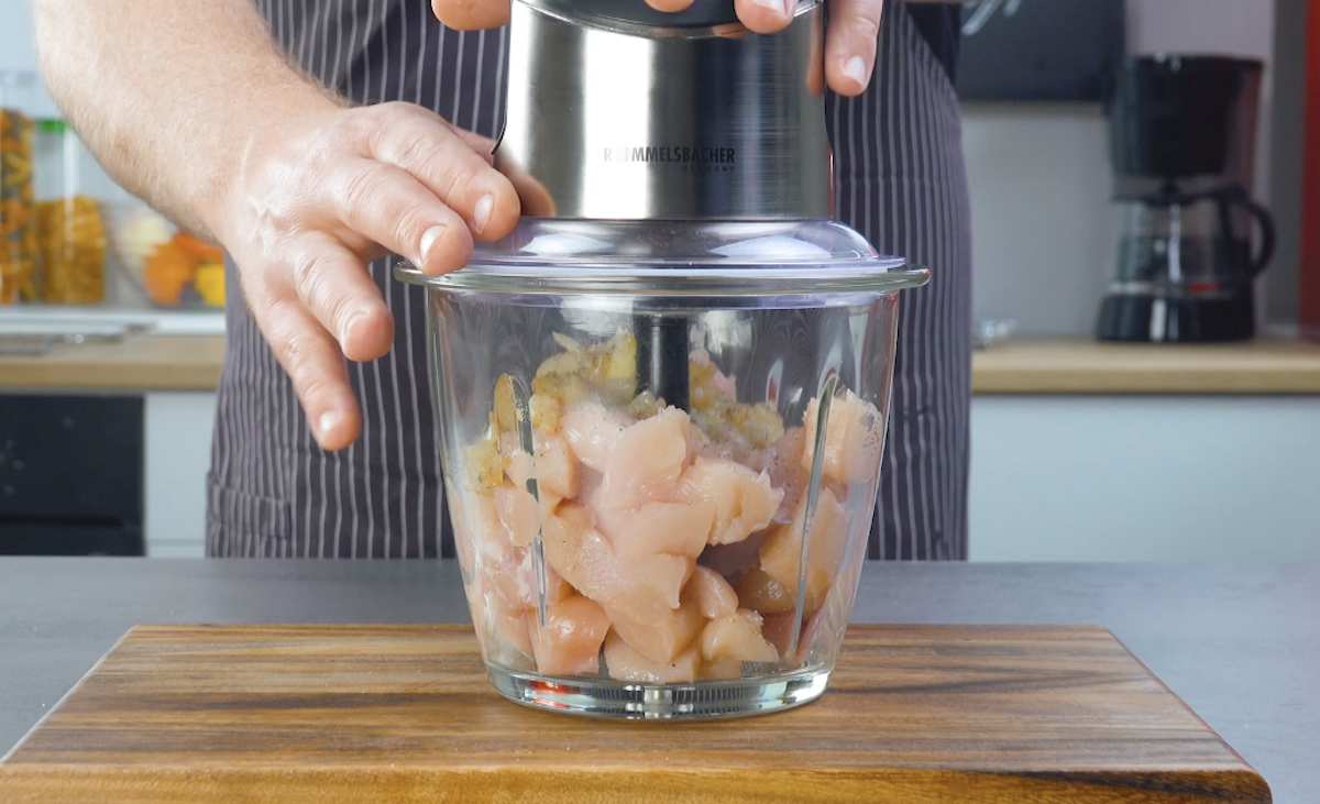 3. Schneide die Hähnchenbrust in walnussgroße Stücke und gib sie dann in einen Zerkleinerer. Füge noch angebratene Zwiebeln hinzu und würze alles mit Salz und Pfeffer. Zerkleinere alles und gib die Masse dann in eine Schüssel.