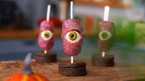 - Verwende 2 Salami-Halbmonde, um sie so an den Spießen zu befestigen, dass nur noch das Auge zu sehen. Spieße sie danach auf das Brot.