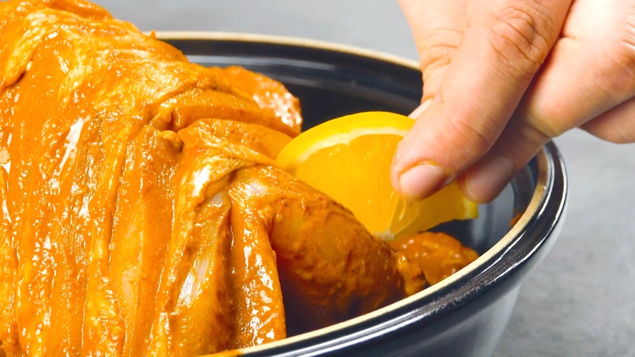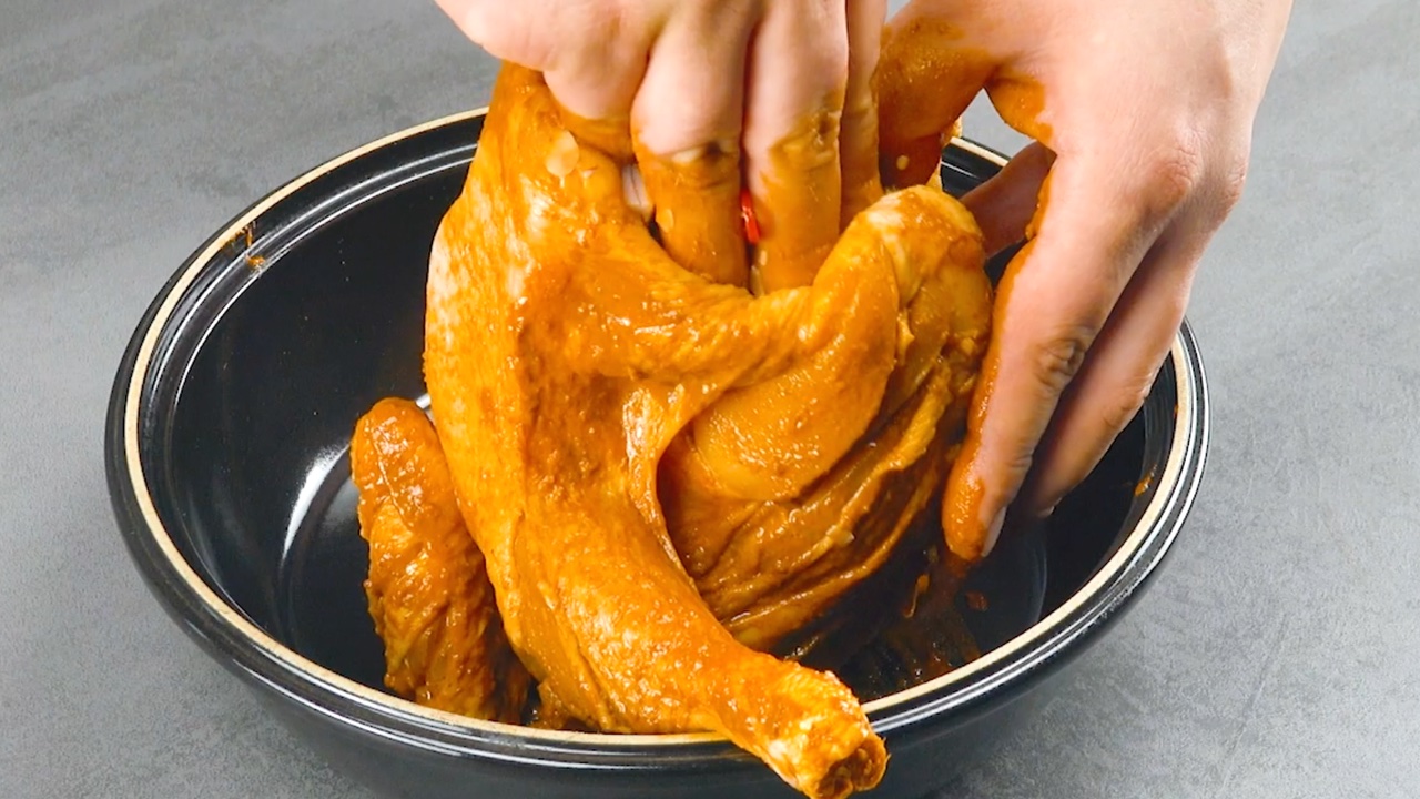 3. Lege nun das Hühnchen in die Schüssel mit der Marinade und reibe es von allen Seiten gut ein. Lasse die Marinade anschließend für etwa 1 Stunde einwirken.