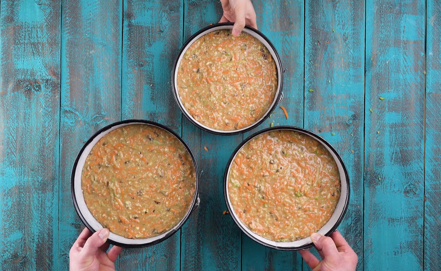 7.) Als Dekor streust du zuerst noch nach Belieben Pekannüsse auf den Kuchen und legst dann als besonderen Blickfang einige geringelte Karottenstreifen auf die Mitte des Deckels.