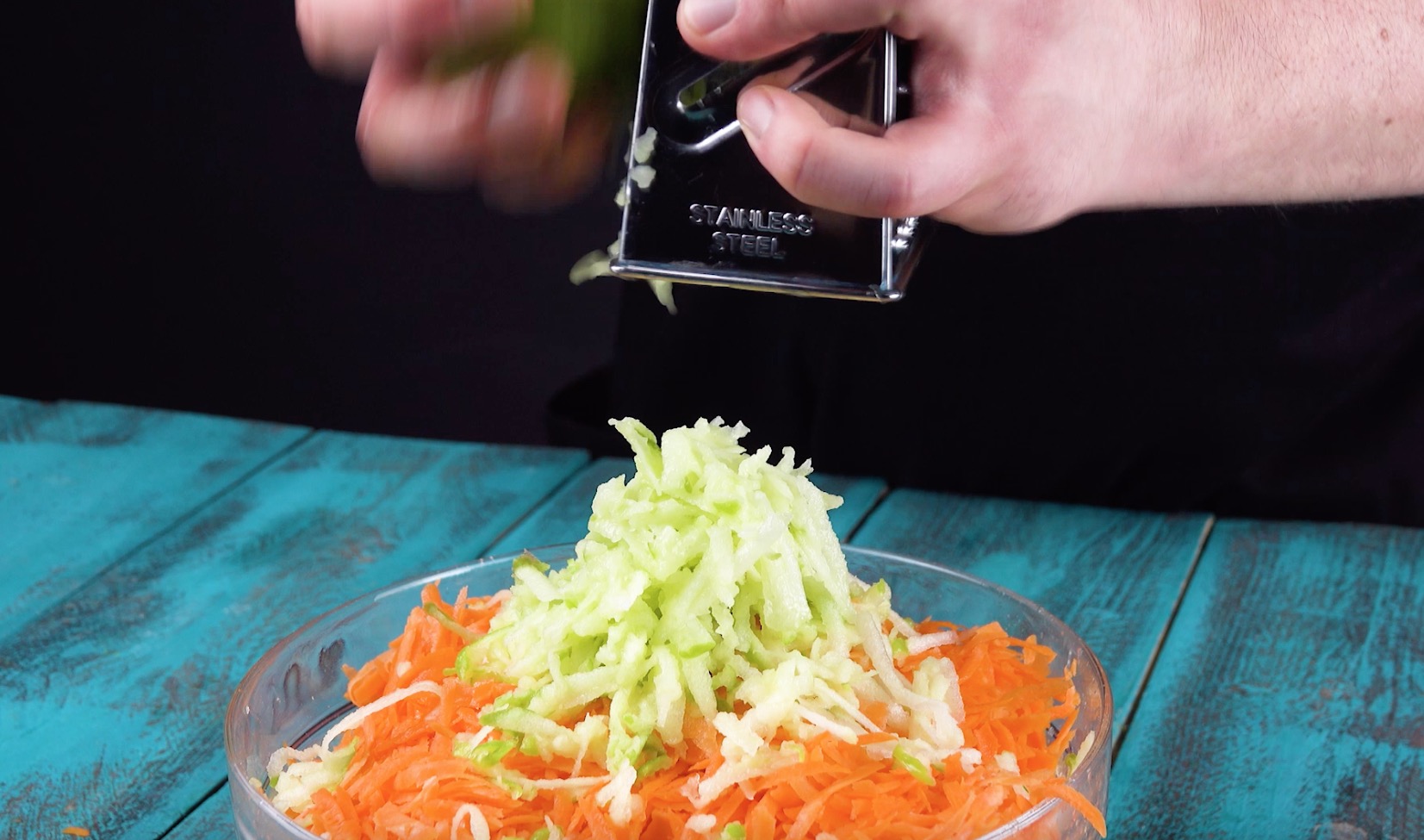 1.) Heize zunächst den Backofen auf 175 °C Umluft vor. Gib für den Teig dann Butter, beide Sorten Zucker, Eier, Buttermilch und Öl in eine große Schüssel und schlage sie mit einem Handrührgerät schaumig. Gib dann die weiteren trockenen Zutaten dazu und reibe die Möhren und Äpfel hinein. Vermenge dann alles noch einmal mit einem Spatel, bis es gut durchmischt ist.
