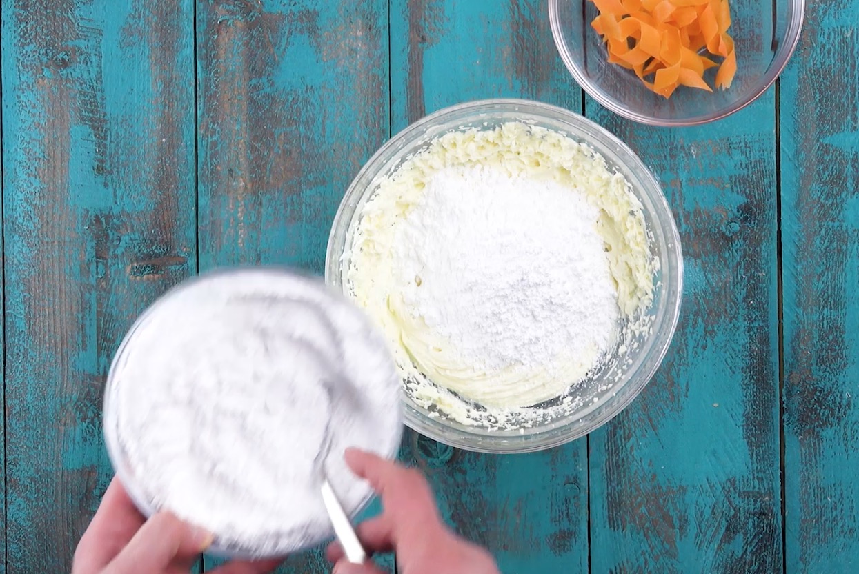 5.) Bereite dann die Creme zu: Schlage dafür Butter und Frischkäse – die etwa die gleiche Temperatur besitzen sollten – zusammen schaumig und rühre nach und nach den Puderzucker ein.