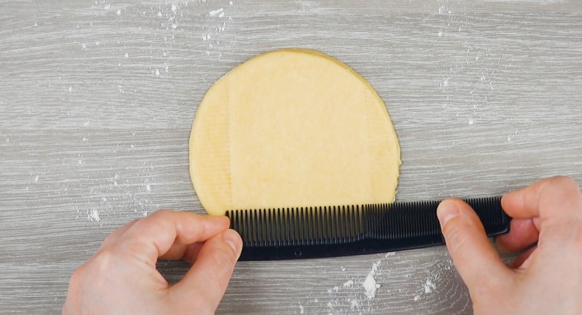 4.1 Rolle den Hefeteig aus und stich einen großen Kreis aus. Drücke den Teig dann an drei Seiten mit einem Kamm ein.