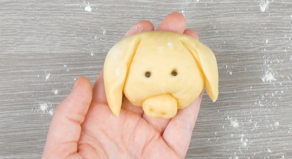 5.5 Stich mit dem Essstäbchen auch Löcher für die Augen in den Teig und lege in diese je eine Schokoperle. Klappe nun noch die Ohren herunter und fertig ist der niedliche Schweinekopf.