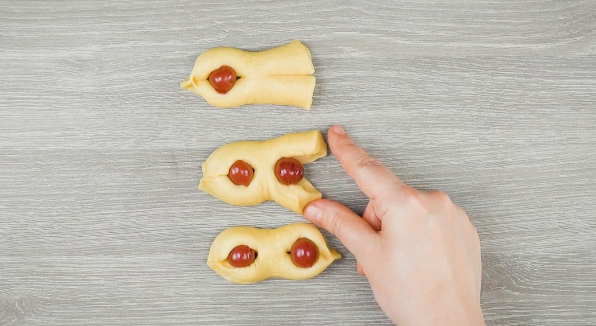 3.2 Schneide die Hefeteigstücke jeweils an beiden Seiten der Länge nach ein.