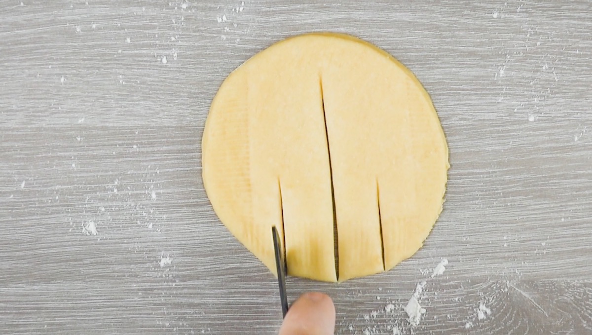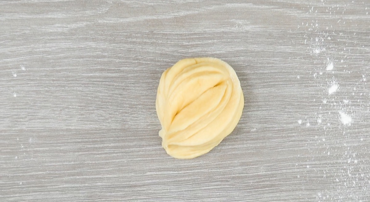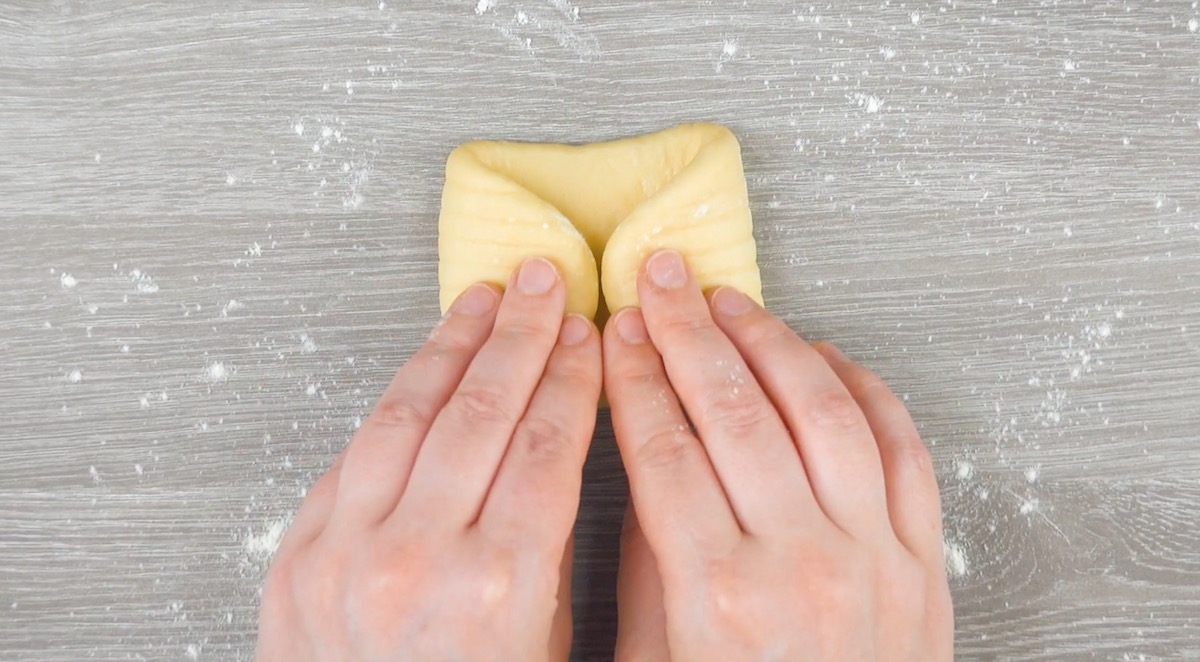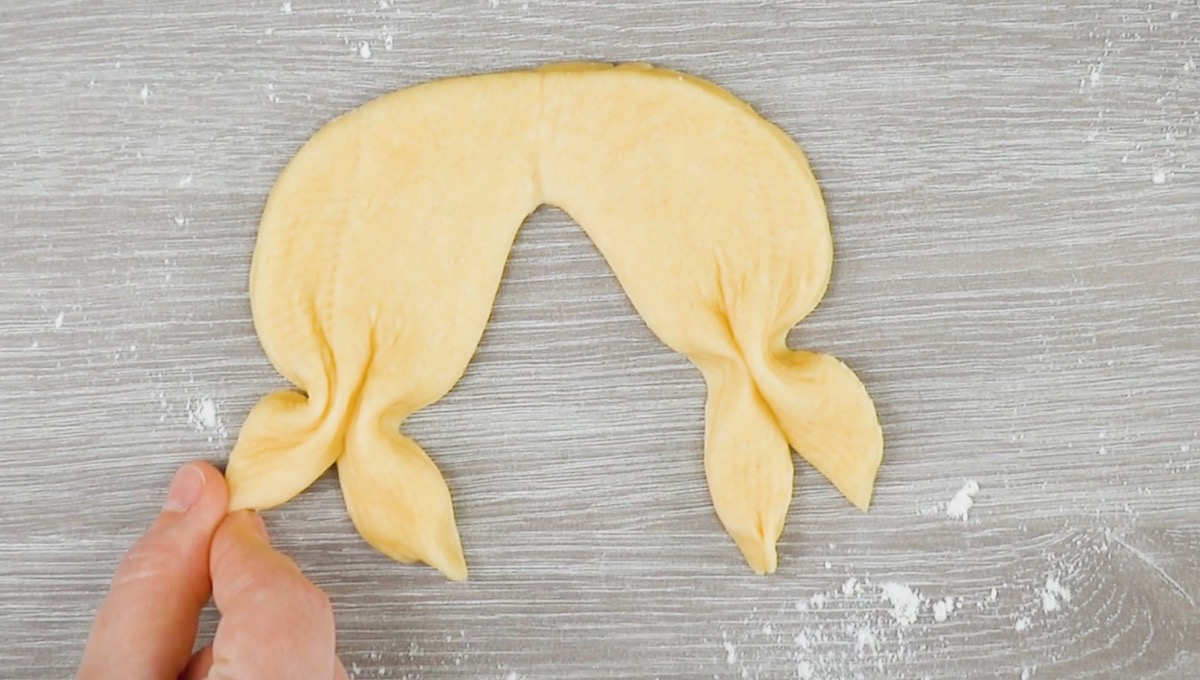 5.2 Rolle dann den Teig, der sich zwischen den zwei Einschnitten befindet, nach unten hin ein.