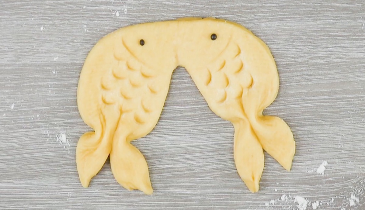 4.3 Ziehe den Teig in der Mitte auseinander und drücke ihn mit den Fingern außen ein, sodass die Fische Flossen erhalten; drücke die Enden der Flossen zusammen.