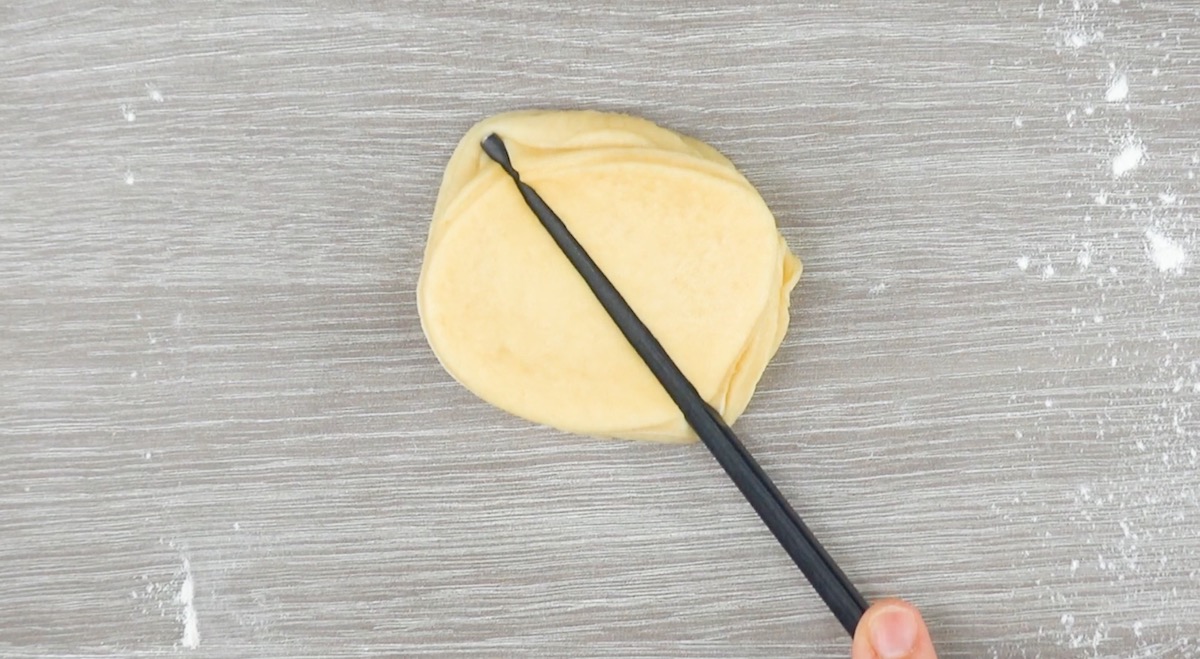 2.3 Drücke erneut mit einem Essstäbchen auf den Hefeteig und drücke die Enden des Teiges zusammen.