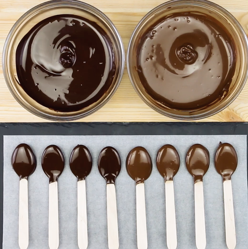 3.) Entweder lässt du die Löffel mit der Schokolade nun kurz erkalten und tauchst sie dann noch einmal in die Schokolade (für mehr Schoki-Genuss), oder du garnierst die Schokolade am Stiel direkt nach Belieben.