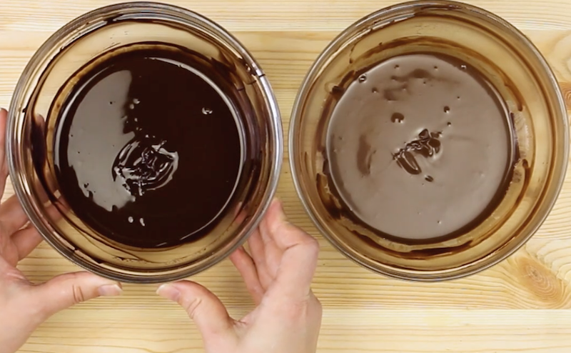 1.) Zuerst lässt du etwas Wasser in den Topf ein und erhitzt es langsam auf dem Herd. Während sich das Wasser erhitzt, gibst du die Vollmilchscholade und die Zartbitterschokolade jeweils in eine Schüssel. Stelle die Schüsseln mit der Schokolade nun in das heiße Wasser, bis sie vollständig geschmolzen ist. Das Wasser muss dazu nicht kochen, es reicht, wenn es heiß ist.