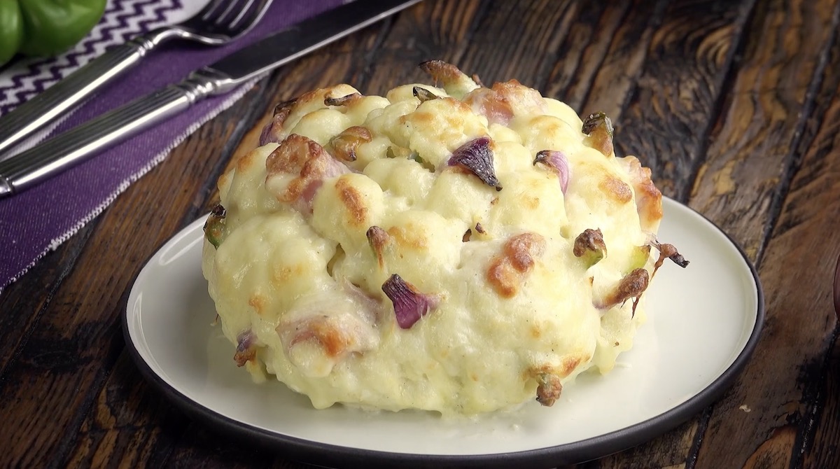 Bestimmt servierst du Blumenkohl normalerweise, nachdem du ihn in einzelne Röschen zerteilt hast. Heute kommt jedoch ein Vorschlag der anderen Art: Lass ihn doch einfach mal am Stück! Mit Gemüse gespickt, Béchamelsoße übergossen und Käse gekrönt, wird das Gemüse zu einem ungewöhnlichen Gericht.